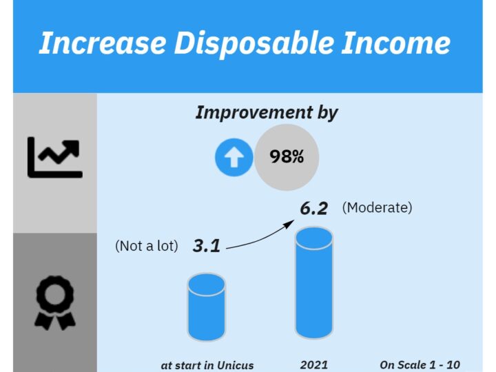 In 2021 Unicus employees disposable income increased by 98% compared to when joining Unicus. An significant improvement from 3.1 (not a lot) to 6.2 (moderate)!